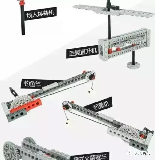 当然,一个玩具运用到的当然不止一种原理,就像“钓鱼竿起重机”,它不仅运用到了齿轮传动,还有杠杆原理和滑轮组原理等。