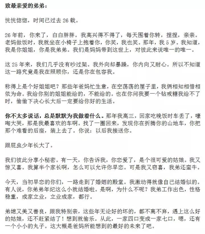 11月12日,26岁的杭州小伙小朱结婚,而其姐姐923字长信更是刷爆朋友圈,看过的人都直呼:有个姐姐真好!
