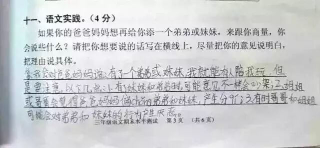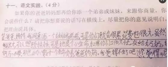 今年三月份左右,广州天河区三年级语文考试题与时俱进地考起了二胎。而针对考试题目“爸妈生二胎好吗?”,小学生们的回答更是火遍朋友圈!