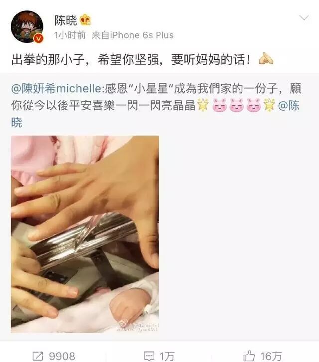 去年,12月20日,陈妍希在微博晒出一家三口的照片生下宝宝--小星星。陈晓转发陈妍希发出的微博报喜:“感恩‘小星星’成为我们家的一份子,愿你从今以后平安喜乐一闪一闪亮晶晶。“证实陈妍希生下儿子。