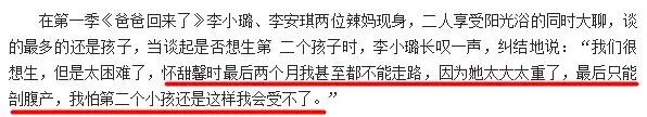 哈哈,原来是因为甜馨在她肚子里太重了,让她两个月都不能走路,“我们很想生,但是太困难了,怀甜馨时最后两个月我甚至都不能走路,因为她太大太重了,最后只能剖腹产,我怕第二个小孩还是这样我会受不了。”