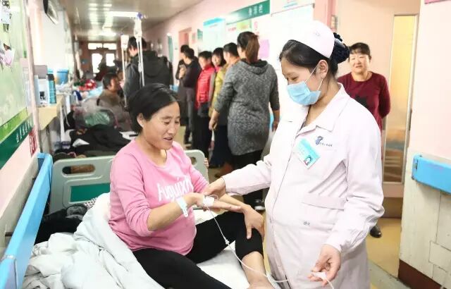 12月16日,在市人民医院产科,二胎孕36周的护士孟雪观察平邑县孕产妇包明秀的输液情况。