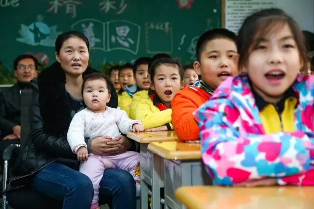 12月23日,在临沂第一小学,家长邱颖抱着二女儿杨晨参加大女儿杨烁(右三)的特色课堂。