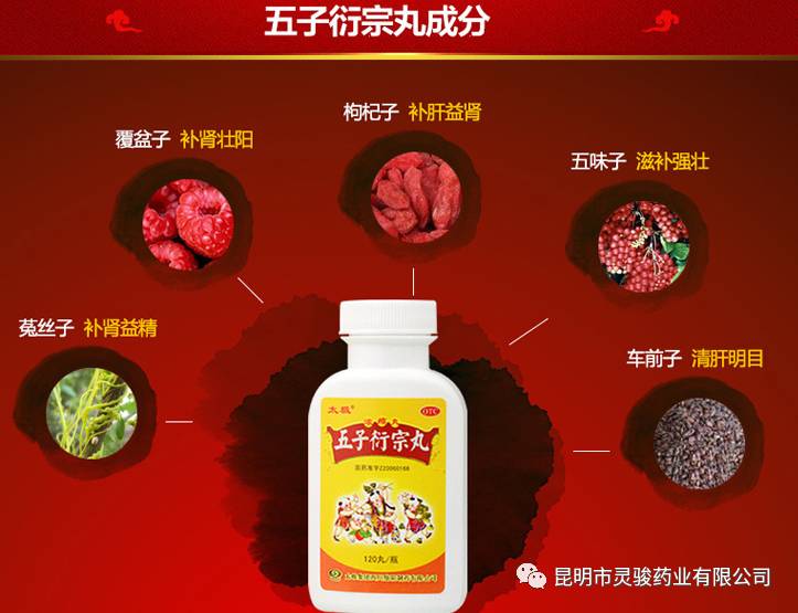 【主要成份】枸杞子、菟丝子(炒)、覆盆子、醋五味子、盐车前子。方中枸杞子、菟子补肾精,壮阳道,助精神;覆盆子养真阴,固精关,起阳痿;五味子补肾水,益肺气,止遗泄;车前子利小便,与上述四子相配,补中寓泻,补而不腻。诸药相配方,共奏补肾益之功效。