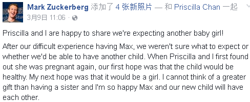 Facebook CEO 扎克伯格宣布一条喜讯!