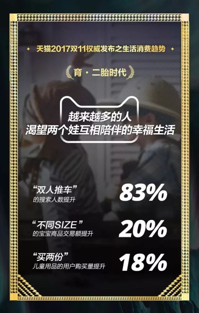 其中,从“育·二胎时代”这个数据上可以看到,双11这天,“双人推车”的搜索人数较往日提升83%;“不同size”的宝宝商品交易提升20%;“买两份”儿童用品的用户购买量提升“18%”。