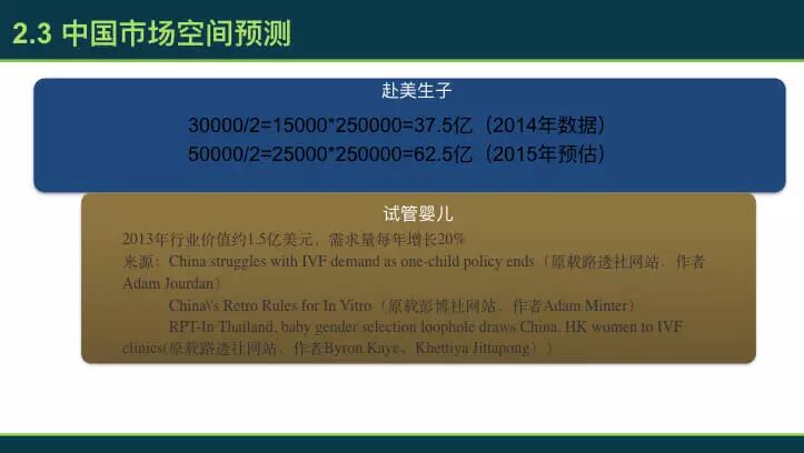 · 根据中国人口协会、国家计生委联名发布的最新《中国不孕不育现状调研报告》显示,中国的不孕不育发病率在12.5%-15%左右,患者人数接近6000万对,平均8对夫妇中就有1对患有不孕不育问题。目前美国的第三代试管婴儿技术成熟,去美国做试管婴儿这一细分领域,在2013年的行业产值达到了约1.5亿美元,需求量每年增长20%。