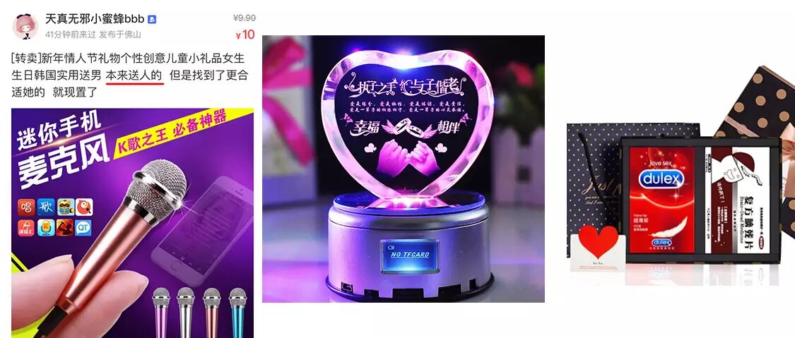 还有一些被转卖的情人节礼物,可以凑成一份《最不被待见礼物清单》,比如七彩发光水晶相座、伪装成套套的“创意礼物”、自以为可爱清奇的小饰品等。
