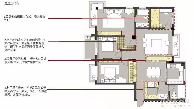 1.进门口区域增加储藏室,储藏室隐藏在鞋柜和餐边柜后面,门从干区位置开。
