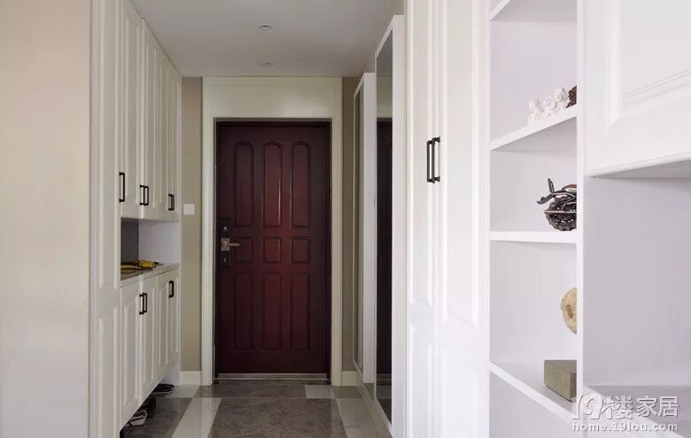 ▲为了迎接二胎的到来,楼主选择在门口左边设置大面积鞋柜,大约可容纳80双。右边设置两边大镜子,并让强弱电箱隐藏在内。