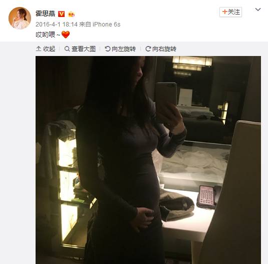 2016年4月1日愚人节那天,霍思燕晒“大肚照”写道“哎哟喂”,半开玩笑式“宣布”怀了二胎,孩子取名“哎呦喂”……
