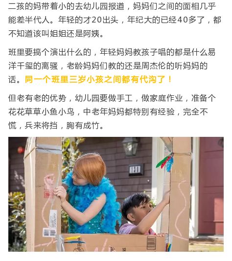 过不了多久,只见幼儿园的中老年妈妈们开始扎堆探讨人生了,当年轻的妈还在担心宝宝吃东西不洗手、冬天不肯穿秋裤怎么办的时候,中老年妈妈们却在讨论奥数技术哪家强,小升初策略谁更高,美高学校好不好了。家里大宝处在人生转折期呢,这种幼儿园的小娃娃算个啥,就是顺带着养养的。
