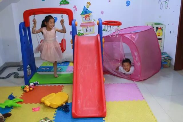 吃完东西,孩子们爬楼梯到阁楼上翻滚起来。阁楼被夫妻俩打造成童趣小王国,摆了熊猫、滑梯、秋千、帐篷,还有课本等。