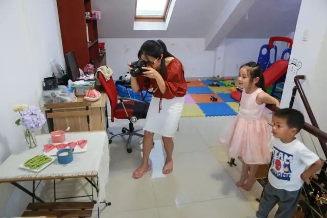 庞云芳把做好的早餐(卡通小鸡配西瓜牛奶等)搬到桌子上,端起相机来。“每天做完,我要先拍好再吃。他们都靠边等一下,哈哈!”这是她要求的,一般是用餐前拍。