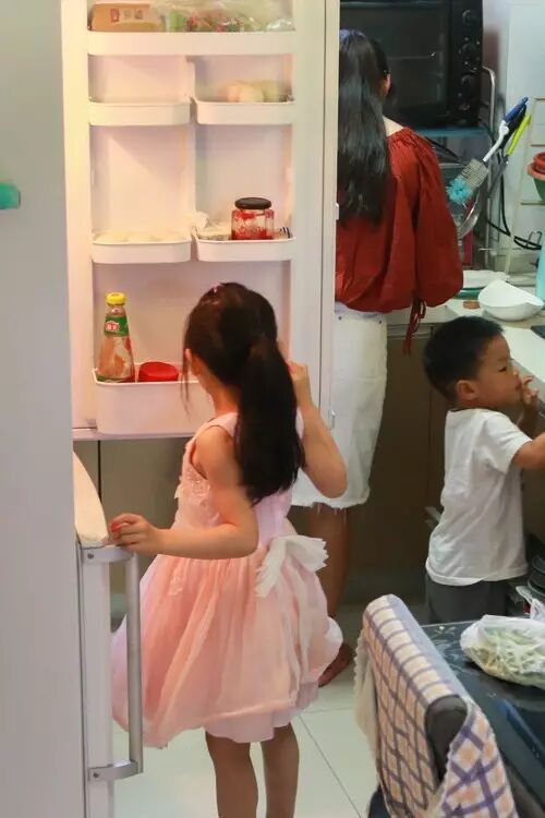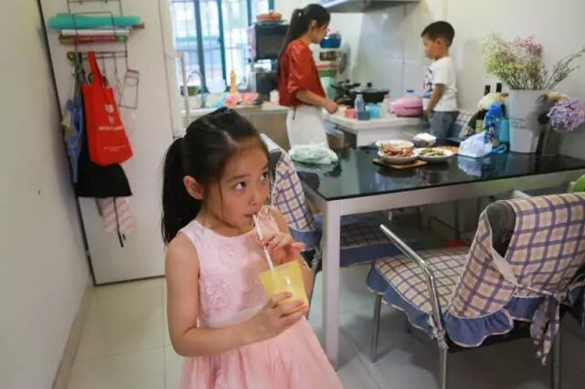 刚吃过晚饭,庞女士在厨房准备水果和牛奶,两个孩子也跑过去“帮忙”。