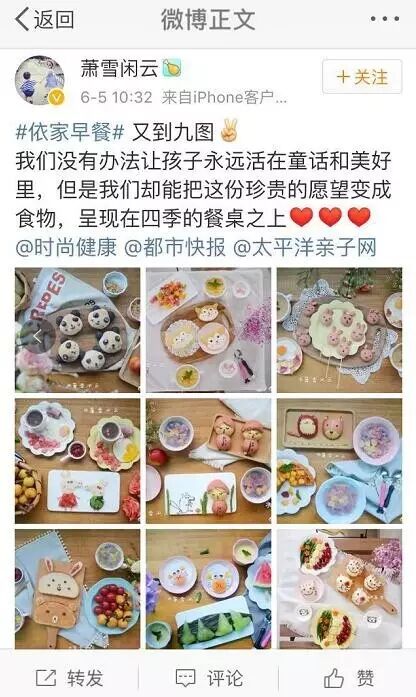 昨天,网友“萧雪闲云”发布了一条微博:我们没有办法让孩子永远活在童话和美好里,但是我们却能把这份珍贵的愿望变成食物,呈现在四季的餐桌之上……并配了9张照片,有卡通的小熊、小羊、小牛……旁边陪衬的是牛奶、玉米、蔬菜等,都是最近博主为孩子们准备的早餐。