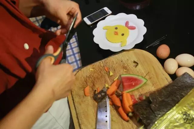 接着她打开冰箱,找来胡萝卜、西瓜、海苔、草莓酱(说是自己酿制的)……又看了一遍手机,然后用小刀雕琢这些材料……