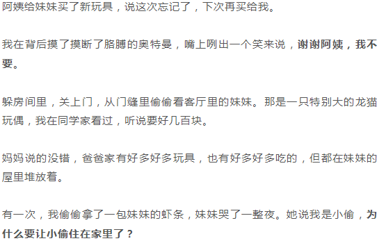 妈妈说,不想让我跟着她继续吃苦。爸爸家有很多玩具,有很多好吃的,还有一个可爱的小妹妹。