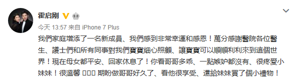 昨天中午,霍启刚在微博宣布,