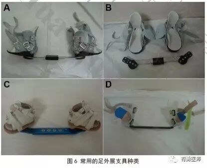 不论何种品牌和生产厂家的足外展支具,在单侧马蹄足的情况下,只要能够维持患侧足外展60-70度,健侧足30-40度;在双侧马蹄足的情况下,双侧足均外展70度。支具的横杆与肩同宽,且横杆应凸面向外弯曲5-10度,以使足固定在背屈位就可以发挥维持矫形、预防复发的作用(图7)。