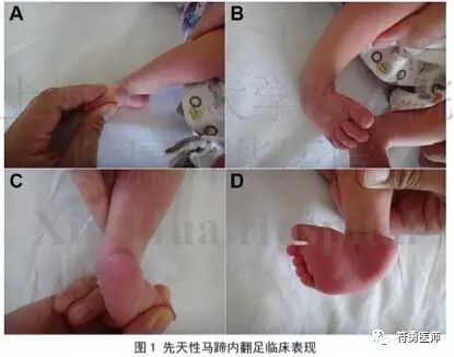 先天性马蹄内翻足是一种出生即有明确表现的足踝部畸形,主要包括踝关节跖屈(图1A)、前足内收(图1B)、后足内翻(图1C)、高弓足(图1D)四部分畸形成分。