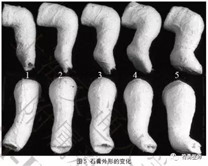在婴儿耐受的情况下,尽量将足外展,在适当用力的情况下保持该位置并进行长腿管型石膏固定。随着前足的外展,跟骨内翻的畸形会逐步得到纠正(图2G&H)。一般通过4~5次手法矫形和膝关节屈曲位的长腿管型石膏固定,除足跖屈畸形以外的所有畸形成分均可完全矫正。石膏塑形技术在Ponseti方法中受到特别的强调,石膏塑型时要保持在矫正的位置,先进行远达足趾的膝以下石膏固定,然后再向上延伸至大腿根部(图4)。石膏要均匀平坦,石膏成型是动态的。石膏定型之前一直用手指做塑型的动作。每次手法矫形和石膏固定纠正一定程度的畸形,从每次固定的石膏外形可以看出足的畸形得到了逐步的矫正(图5)。