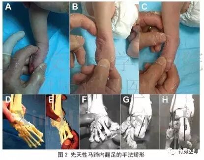 这是需要着重介绍的部分,共包括以下几个内容:I)手法和石膏:医生用拇指固定距骨头,抬高第一跖骨以纠正高弓畸形(图2A&C&D&E);