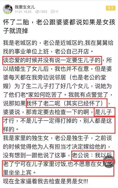 @己乙庚:有朋友遇到过,怀二胎的时候婆家让去检查,男孩就生下来,女孩就流掉,她老公来跟她商量,她说要流就离婚,她老公又回去做思想工作,婆家说要生可以,要是女孩就不帮忙带,最后幸好生了个男孩,也不用再闹了。