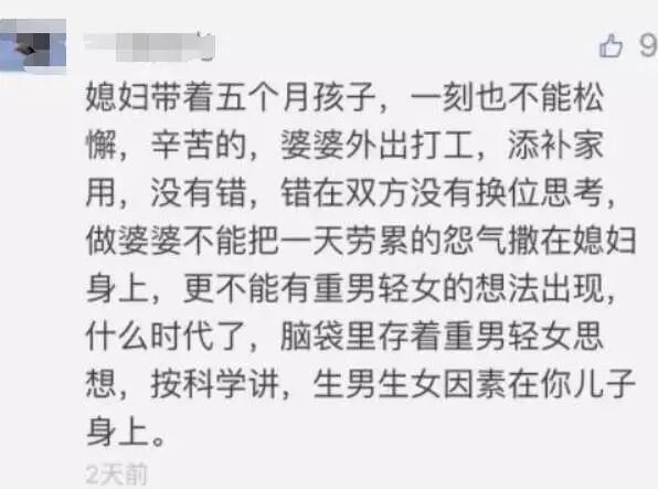 @一缕阳光:媳妇带着五个月孩子,一刻也不能松懈,辛苦的,婆婆外岀工作,添补家用,没有错,错在双方没有换位思考,做婆婆不能把一天劳累的怨气撒在媳妇身上,更不能有重男轻女的想法出现,什么时代了,脑袋里存着重男轻女思想,按科学讲,生男生女因素在你儿子身上。
