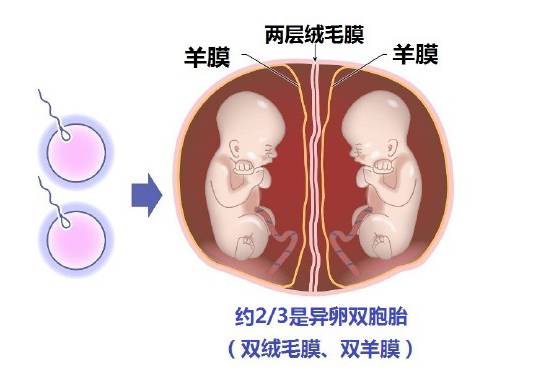 双绒毛膜双羊膜囊(DCDA)——两个卵子同时受精或者一个受精卵迅速分裂成两个,每个宝宝都有自己的独立的胎盘,分别有独立的一层的绒毛膜和一个羊膜腔。