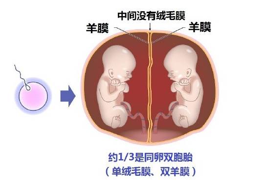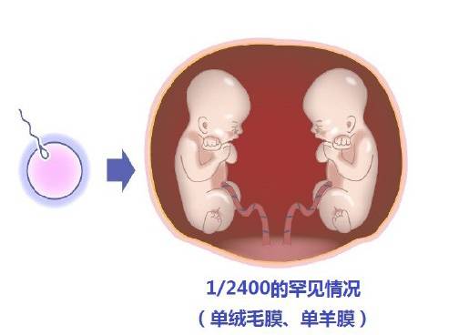单绒毛膜单羊膜囊(MCMA)——一个受精卵更迟分裂成两个,两个宝宝共享一个胎盘,位于同一绒毛膜内而且没有羊膜分隔,这也是同卵双胎的一种,但由于胎儿脐带会相互缠绕,因此非常危险。