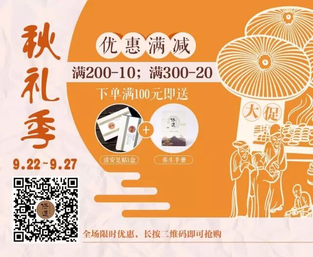 佟道养生馆推出“秋礼季”优惠满减活动,9月22至27日,下单满100元即送清安足贴1盒+养生纪念手册,满200立减10元,满300立减20元!