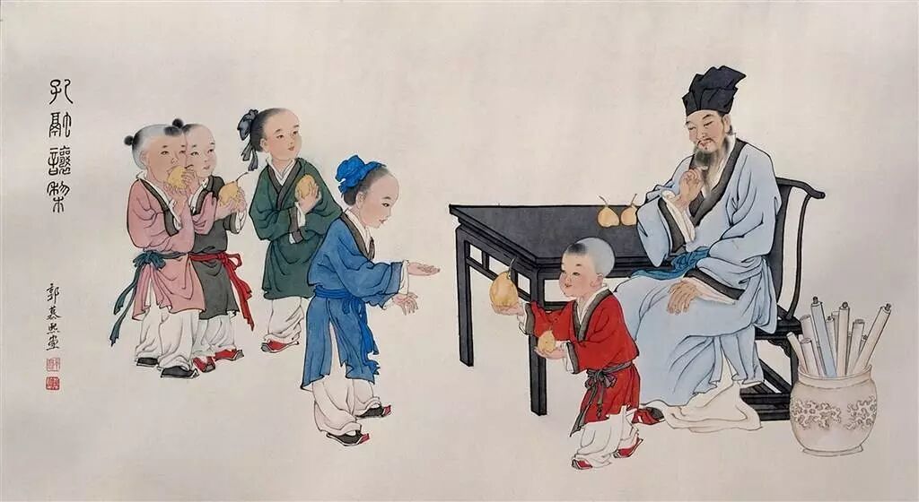 《三字经》有云:“融四岁,能让梨。悌于长,宜先知。”这句话说的是大家耳熟能详的东汉时期“孔融让梨”的故事。有一次,父亲的朋友带来了一盘新鲜的梨,父亲就让他们兄弟自幼至长分来吃。于是,最小的弟弟最先选了一个最大的给自己。而稍后的孔融则选了最小的一个给自己。父亲暗暗欣喜,脸上却平静地问孔融说:“你为什么拿个最小的梨呢?”孔融回答:“我年龄小,就应该吃最小的,让哥哥们吃大的。”父亲又问他说:“那小弟比你还小,为什么又拿了最大的?”孔融则说:“弟弟还小,不懂事,所以我们都要让着他。”
