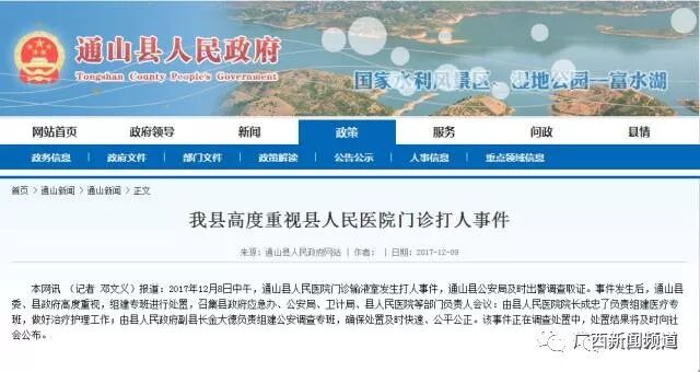 通山县人民政府通报称:针对门诊输液室发生的打人事件,12月9日,通山县委已免去徐良路城管局长职务。对打人事件当事人,公安正在依法调查处理,处理结果将及时向社会公布。