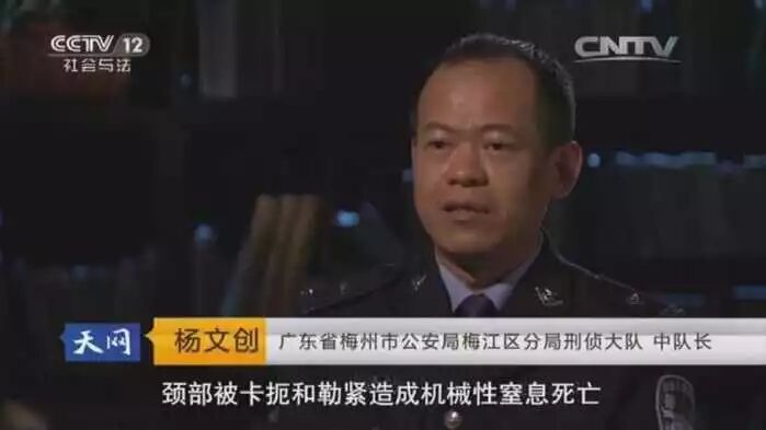 梅江区分局刑侦大队的人在楼下就闻到这股怪味,技术人员将床下塞满的被子取出来后,被子上充满了血迹,透过缝隙看去,里面有一具尸体,尸体在床底下,已高度腐败,尸体周围地板上布满了大量的虫子,死者是一名女性,年龄在25岁左右,仰面躺在床下的地板上,面部已无法辨认。在尸体边发现一个晾衣的塑料架,大概长90CM左右,这个晾衣架成垂直状,摆放在尸体旁边,在死者的颈边还包裹着一只白色包装袋,颈部也发现有锁钩,舌骨骨折,死亡原因为颈部被卡勒和勒紧造成机械性窒息死亡。