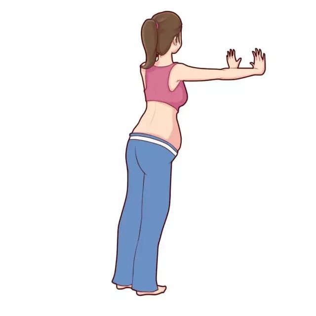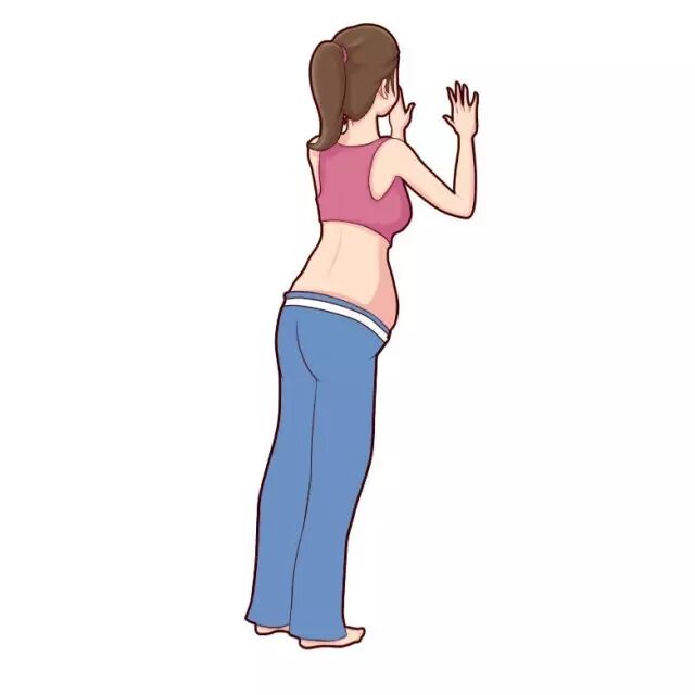 step1 面对墙一臂距离站立,双脚分开与肩同宽,手掌贴墙。