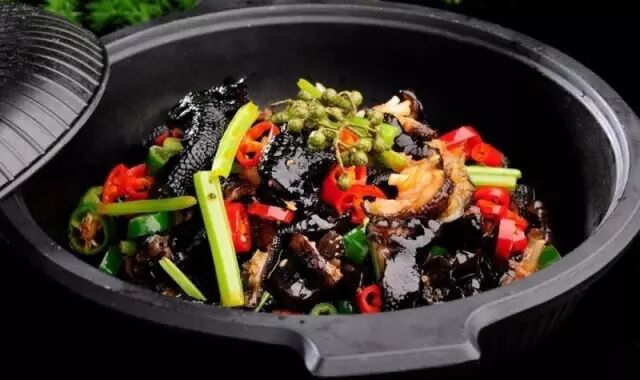 这是一道创新菜,鸡块要先在锅里用姜、蒜、等调料炒香,然后盛入石锅内,用文火熬制,时而翻转,待八分熟之时加上鲜花椒、尖椒块、鲜子姜、美人椒等一起放入石锅内焖煮,鸡肉完全熟透就可以上桌享用了。