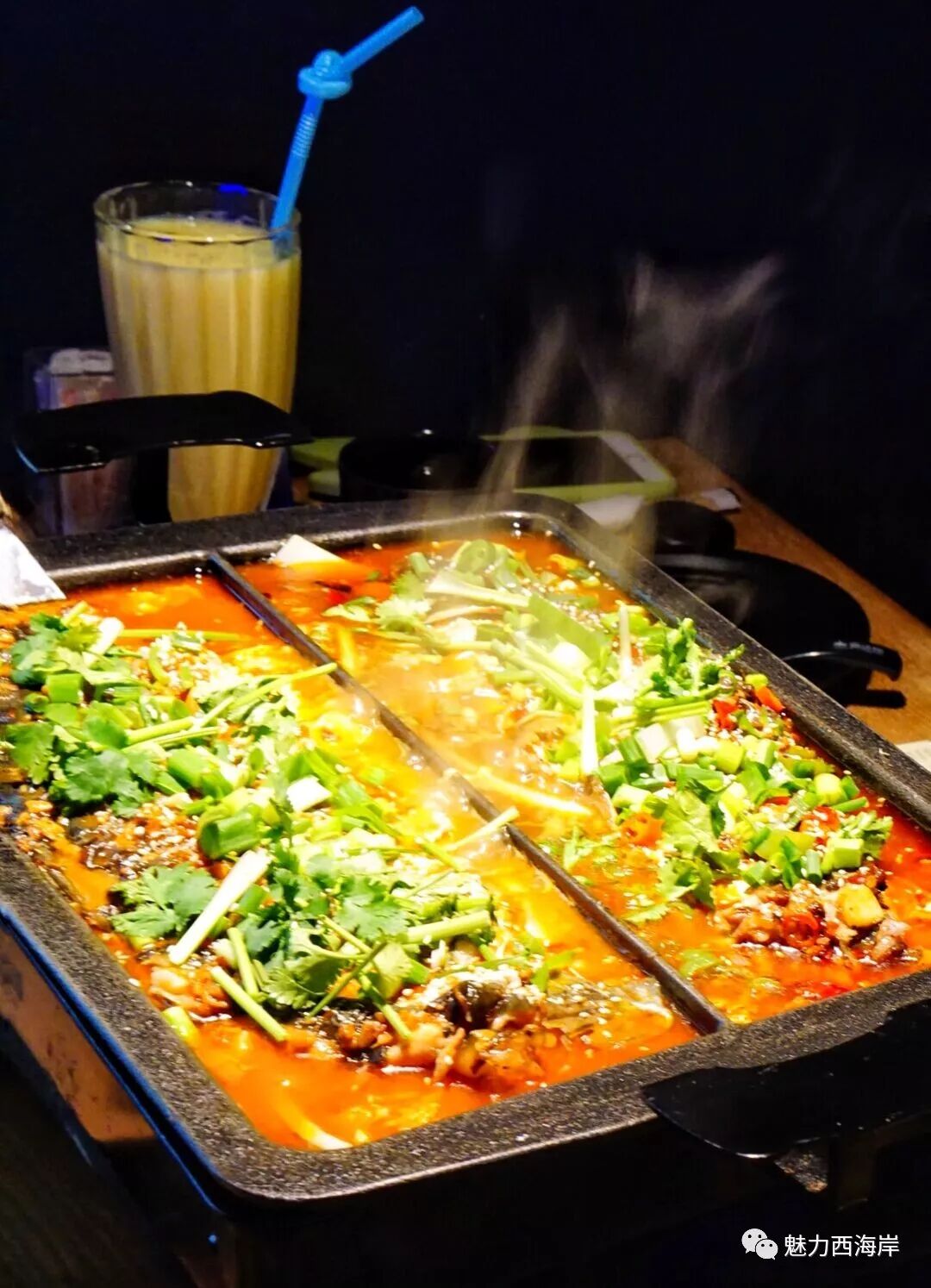 更重要的是,魔法师烤鱼可以做双味烤鱼哦,也就是一鱼两吃,你可以像超哥一样选择酸辣(香辣)+山东蒜香,这样吃一次烤鱼就能同时品尝到烤鱼的鲜香+辣,口感超棒哦!