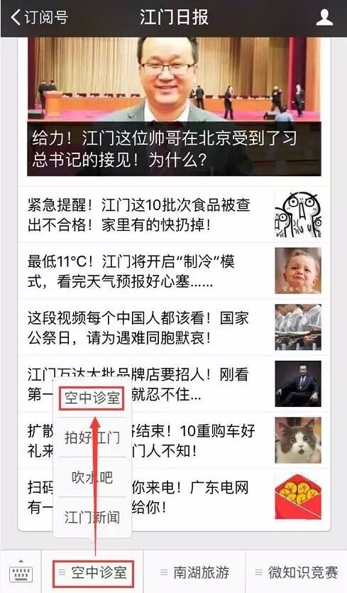 方式二:关注“江门日报”官方微信(jm_daily),点击底部菜单上的“空中诊室”,即可参与互动;