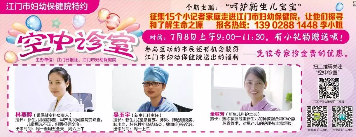 本期“空中诊室”出诊的专家有江门市妇幼保健院新生儿科主任吴玉宇、眼保健专科负责人林燕婷、新生儿科护士长金敏芳。这三位专家将现场开讲,为小记者们详细讲解“‘我’是从哪里来?”“袋鼠式新生儿创新护理”“如何保护眼睛?”让小记者们对生命的起源了解得更透彻。
