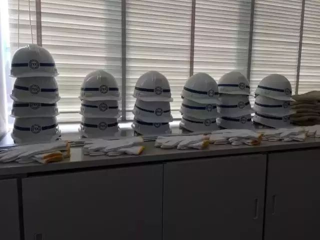 进入工地的任何人都要换上统一的工装,戴上安全头盔并且穿工装鞋。