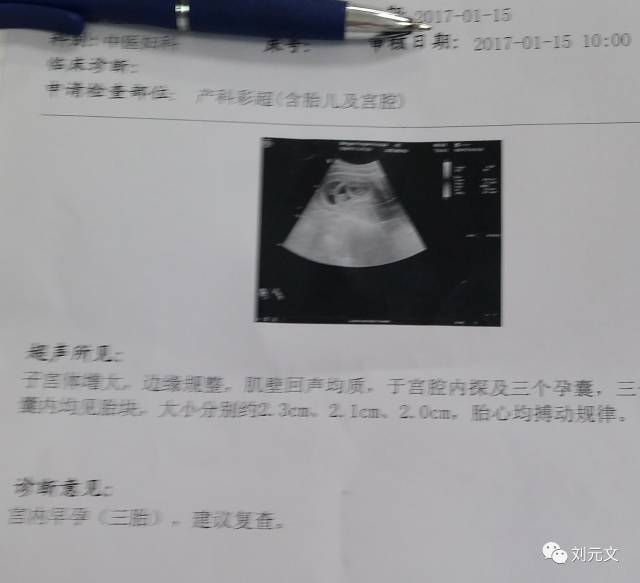 2017.1.4 B超检查:患者怀孕三胞胎,均见胎心。妊娠顺利,建议患者减胎保留两个或者1个,患者拒绝。妊娠继续。1.15 复查B超:妊娠顺利。