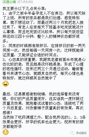 3、心态真的很重要,我跟我老婆前面半年就是心态比较的急,而且越是没怀越是急,形成了心理的恶性循环,后来这两三个月通过运动,睡前看看书来调节心态,就顺其自然吧,每天心情也是特别好,就这样顺其自然就中了?