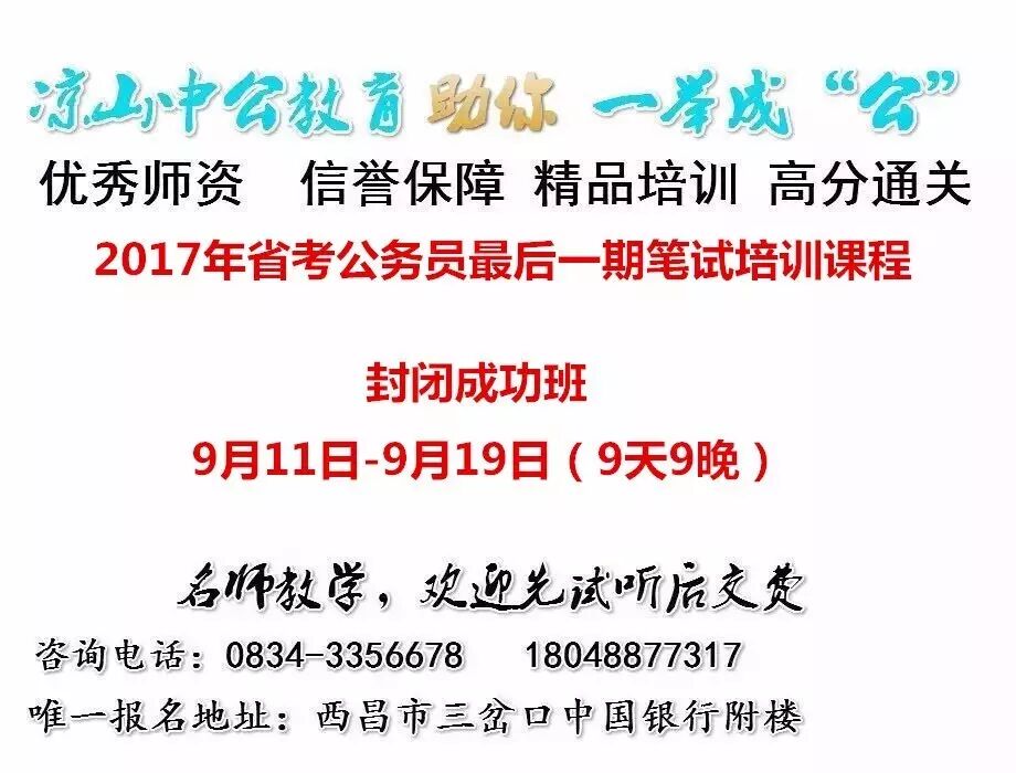 随着公考的临近,凉山中公教育最后一期笔试培训课程封闭刷题班:9月11日—9月19日(封闭包吃住,9天9晚)。最优质的师资,最精准的培训讲义与习题,助力您在笔试中顺利通过!