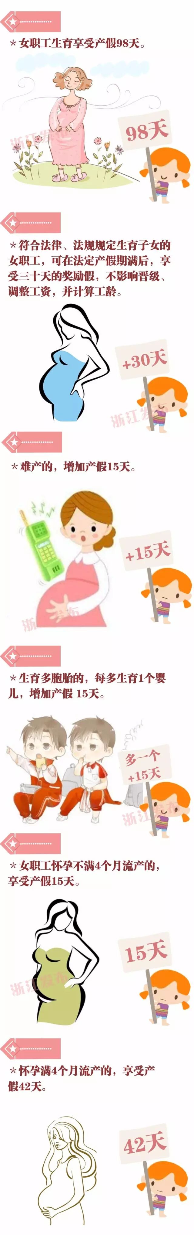 当然,这次出台的《办法》中也有了明确的规定,新修订的《办法》根据《中华人民共和国劳动法》、《中华人民共和国妇女权益保障法》、《女职工劳动保护特别规定》等法律法规,并结合浙江实际做了修订,规定女职工生育后享受产假98天(以前是不少于90天),如符合《浙江省人口与计划生育条例》第三十条规定的(2016年1月1日以后符合法律、法规规定生育子女的夫妻),女方可在法定产假期满后,享受30天奖励假,不影响晋级、调整工资,并计算工龄。