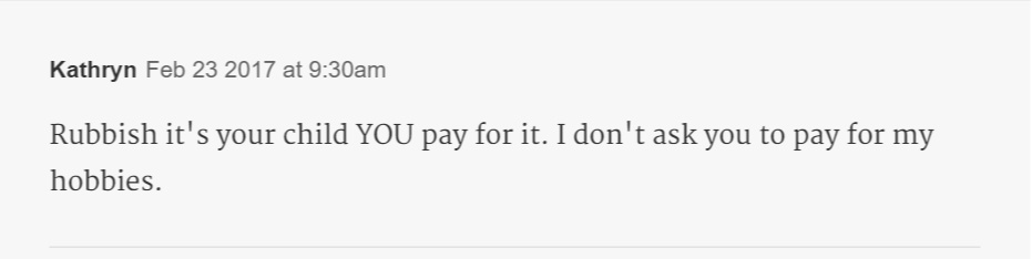 Kathryn认为“你应该为自己的孩子买单,就像我不会要你为我的兴趣爱好买单。”