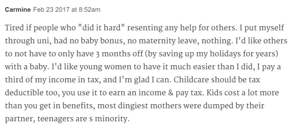 Carmine 表示自己是在没有任何帮助下,上学工作和怀孕生子,非常辛苦。她表示希望其他的年轻女士能比她幸福,拥有更长的带薪产假。最后,她说孩子的花费远比你得到的好处多得多。