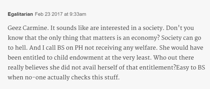 “这不是一个普遍性政策。我做为一个单身妈妈也经历过非常严峻的生活,而且在那时还要在没有任何人的帮助下要保住一个兼职工作,养活自己和孩子;但是现在我们大家有这个“福利施舍心态”。除非我们做出艰难的决定,否则我们在将来不能为那些真正需要帮助的人提供帮助,比如,老年人、患病者和困难户。”