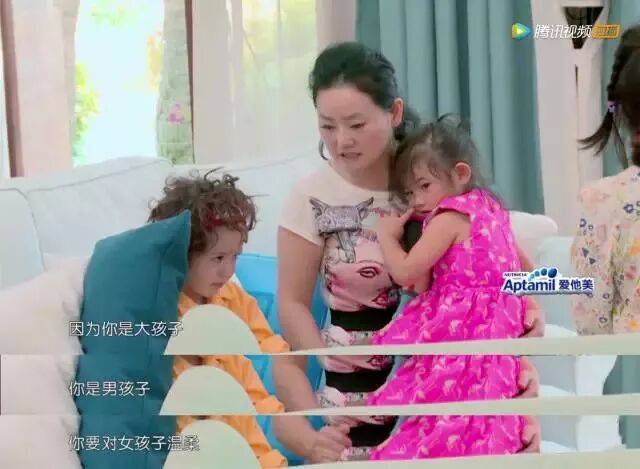 终于,当两个孩子同时看上一个玩具,矛盾爆发了:周妈妈和Jackson说,把旁边倒下的布景板放好,就给他玩具,结果儿子放好了,她竟然直接递给了浸浸,“给妹妹玩一下下。”