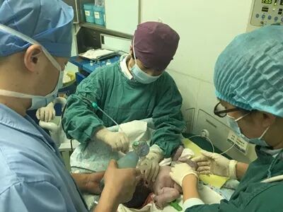 3点整,在完成颈内静脉置管、周围静脉置管、安置合适体位、消毒、全麻等一系列工作后,手术正式开始。手术由钱镕主任医师和徐学麟副主任医师主刀,胎儿很快被取出,是名2800克的女孩,新生儿科医护人员立即接手检查、救治宝宝。另一边刘女士情况迅速凶险起来,子宫胎盘血管在胎儿娩出后开放,血液喷涌而出,瞬间染红了手术区,血压从114/74mmHg瞬间下降到52/30mmHg,监测仪警报声立即响起,“手术之战”到了关键时刻。